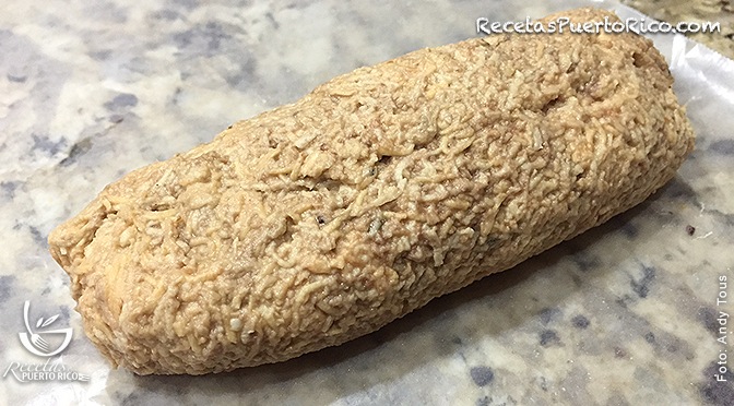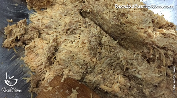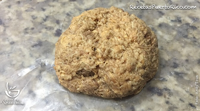 - Mezcle la maza de la yautia, el guineo y el platano añadiendo el aceite de achiote, sal y sazon con achiote.