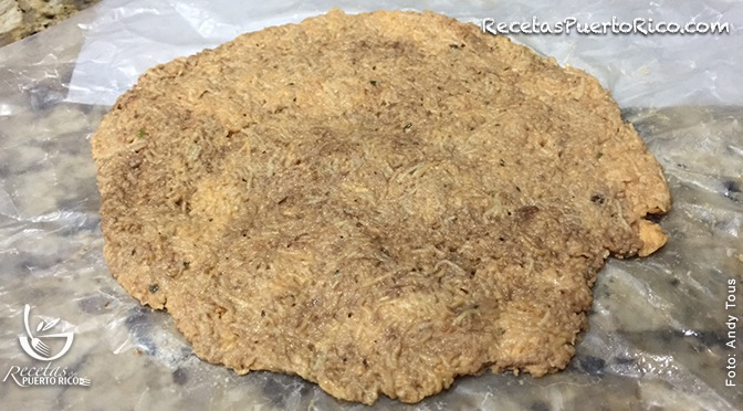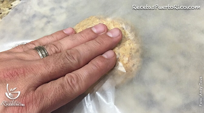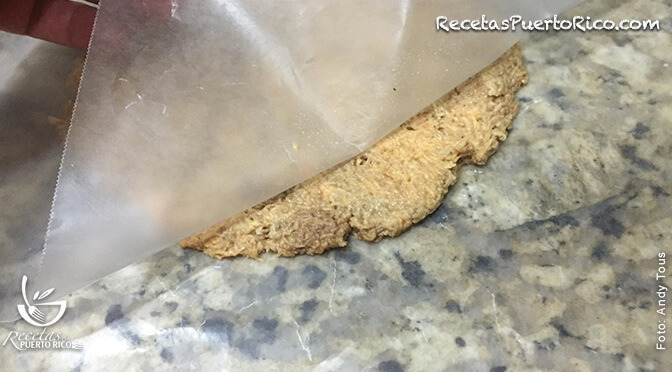 Con la masa fria y lista para moldear, coloque aproximadamente 2 cucharadas de masa sobre papel encerado. Dele forma circular a la masa. Asegure no hacer la base muy fina (como si fuera una pizza pequeña pero gruesa).