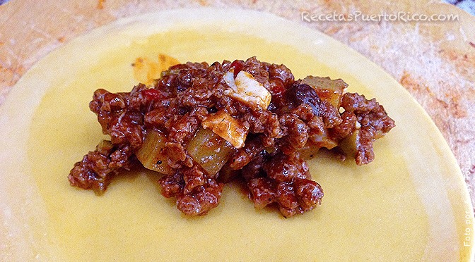 - En un disco de harina amarilla, añade 1½ cucharada de picadillo de carne en el centro del disco.