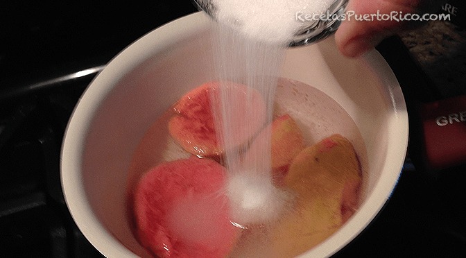 - Regresa las guayabas a la cacerola y añade suficiente agua, justo para cubrirlas.