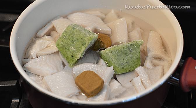 - Agrega el sofrito, un sobre de sazón, los cubitos y mezcla todo bien.