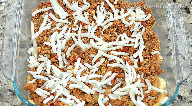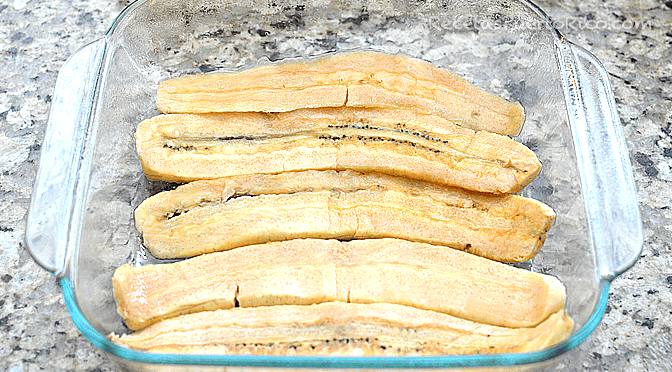 - Coloca las lonjas de plátano cubriendo el fondo del molde