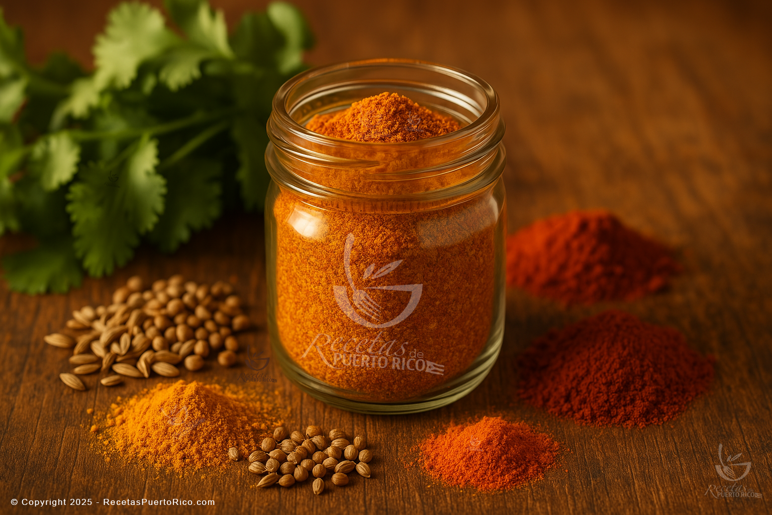 - Combina todos los ingredientes en un tazón seco y mezcla bien.2 cucharadas achiote, 1 cucharada ajo, 1 cucharada cebolla, 1 cucharada cilantro, 1 cucharada culantro, 1 cucharadita comino, 1 cucharadita cúrcuma, 1 cucharadita paprika, 1/2 cucharadita azafrán, 1/2 cucharadita orégano, 1/2 cucharadita pimienta, 1/4 taza sal
